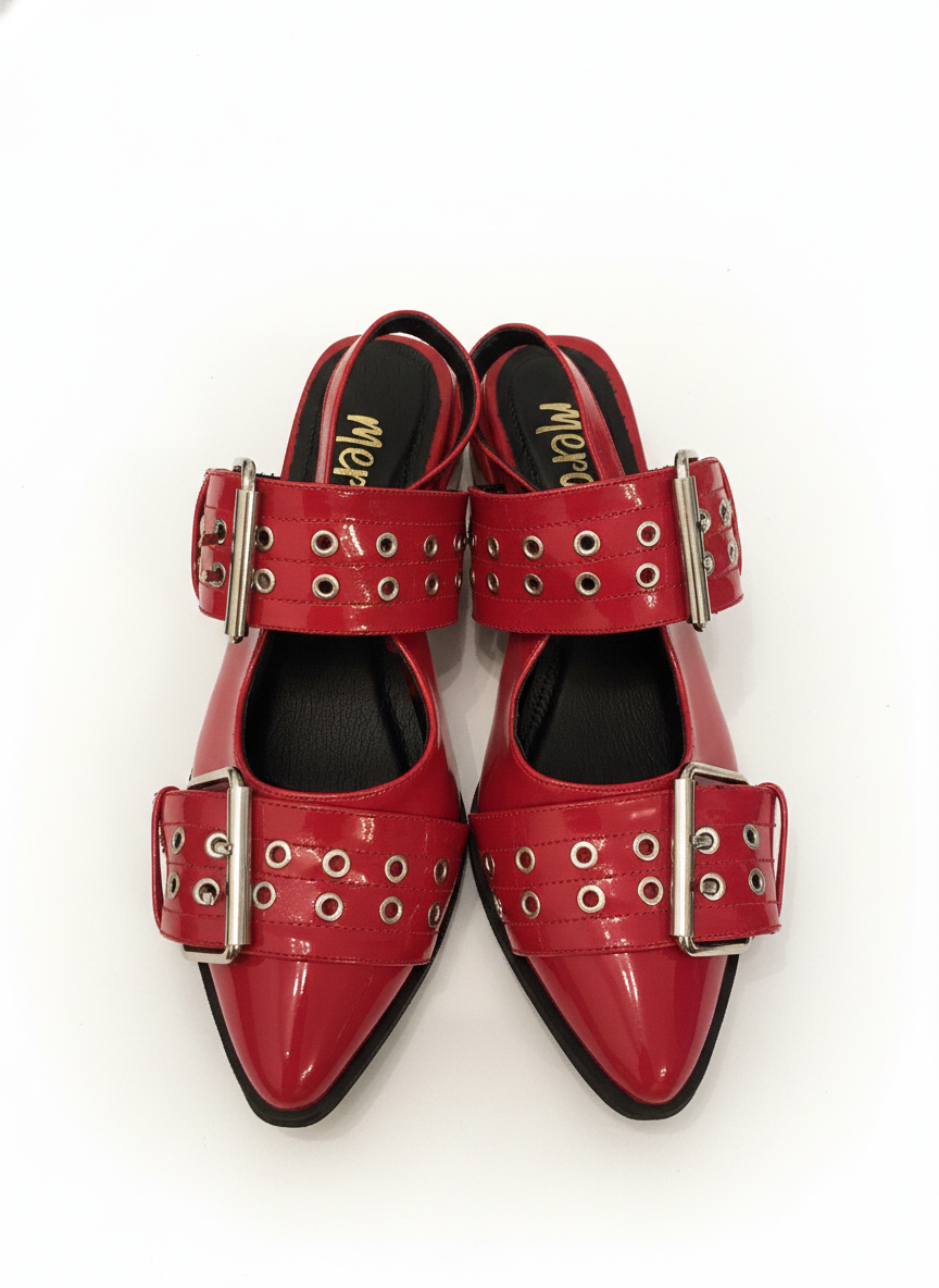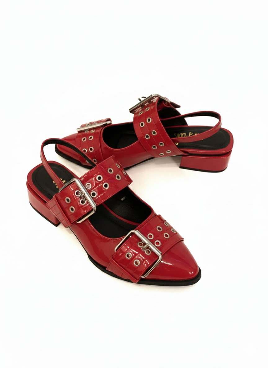 - Diseño slingback con correa trasera y hebilla adaptable.